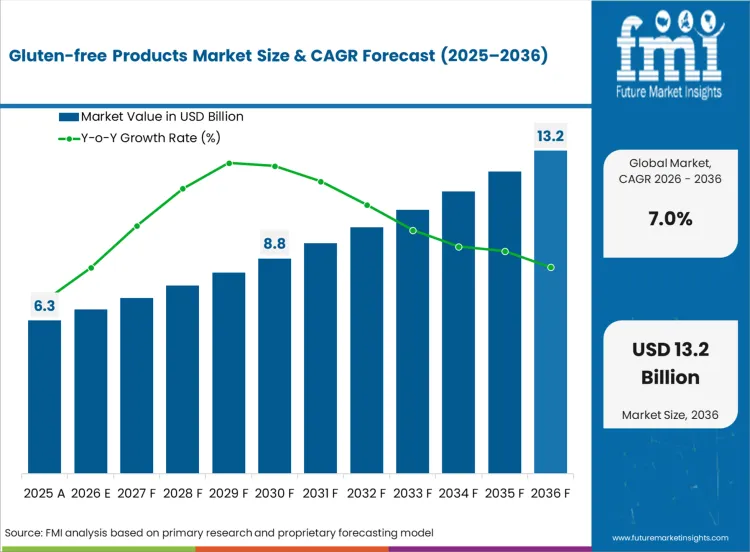 According to analysis by Future Market Insights (FMI), the gluten-free products market was valued at USD 6.3 billion in 2025. It is projected to reach USD 6.7 billion in 2026 and climb to USD 13.2 billion by 2036, reflecting a steady 7.0% CAGR over the forecast period.