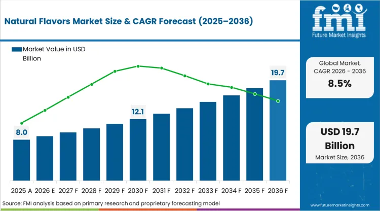 The global natural flavors market is entering a decade of structural transformation, driven by shifting consumer trust, regulatory scrutiny, and supply chain volatility. According to analysis by Future Market Insights (FMI), the market was valued at USD 8.0 billion in 2025 and is projected to reach USD 8.7 billion in 2026. By 2036, revenues are expected to climb to USD 19.7 billion, reflecting a robust CAGR of 8.5%.