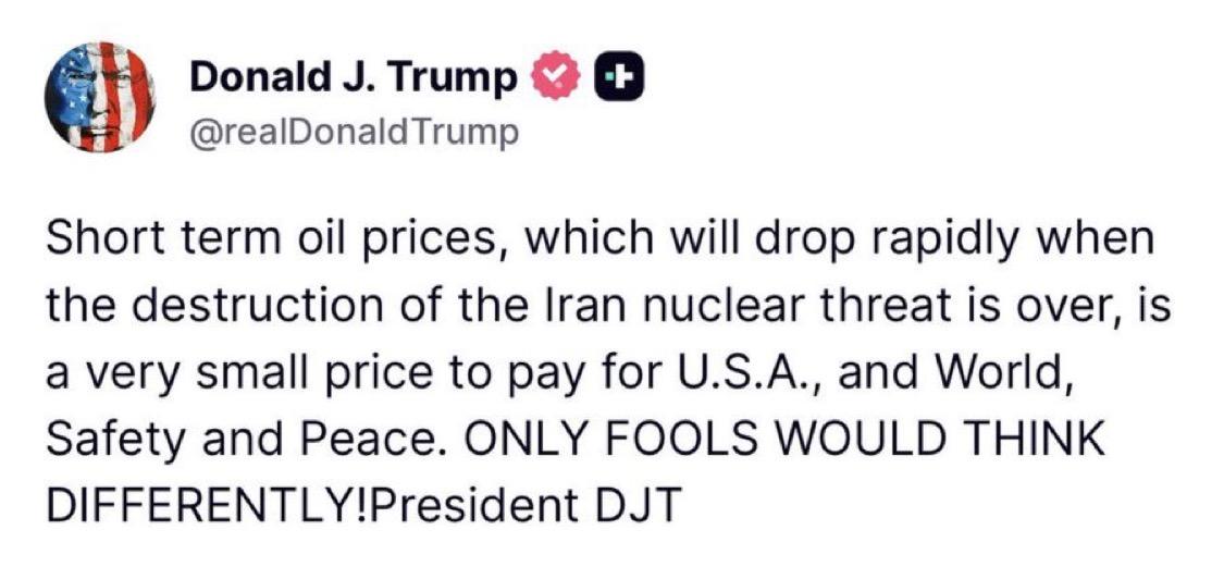 | AGORA: DECLARAÇÕES DE TRUMP SOBRE O PETRÓLEO: "Os preços do petróleo a curto prazo, que cairão rapidamente quando a destruição da ameaça nuclear do Irã terminar, são um preço muito pequeno a pagar pela segurança e paz dos EUA e do mundo. SÓ OS TOLOS PENSARIAM DIFERENTE!"
